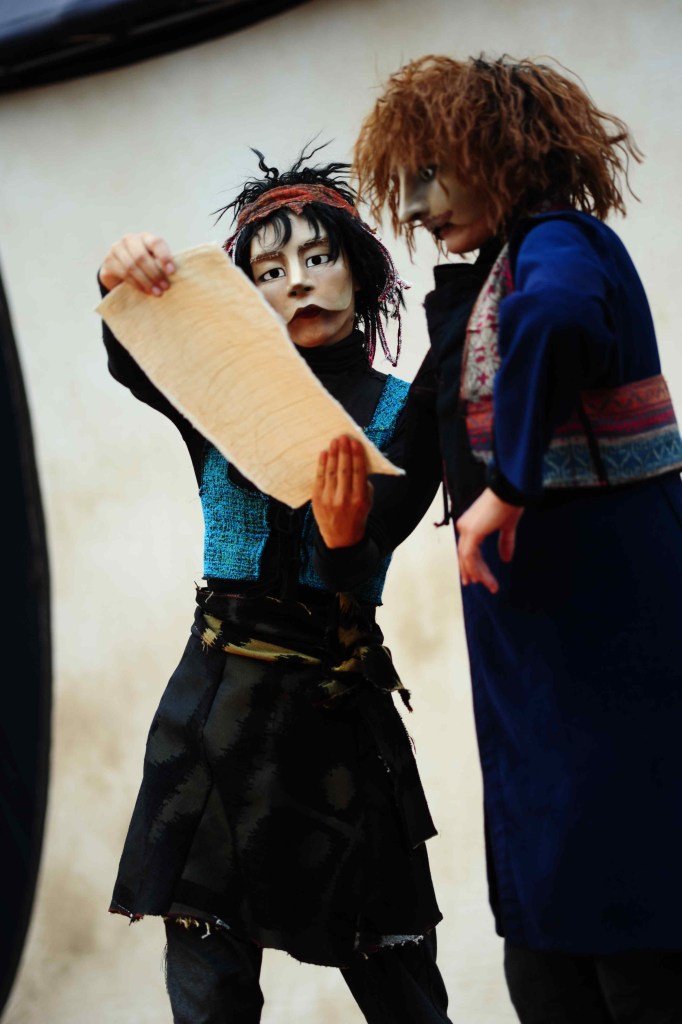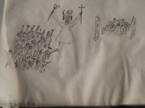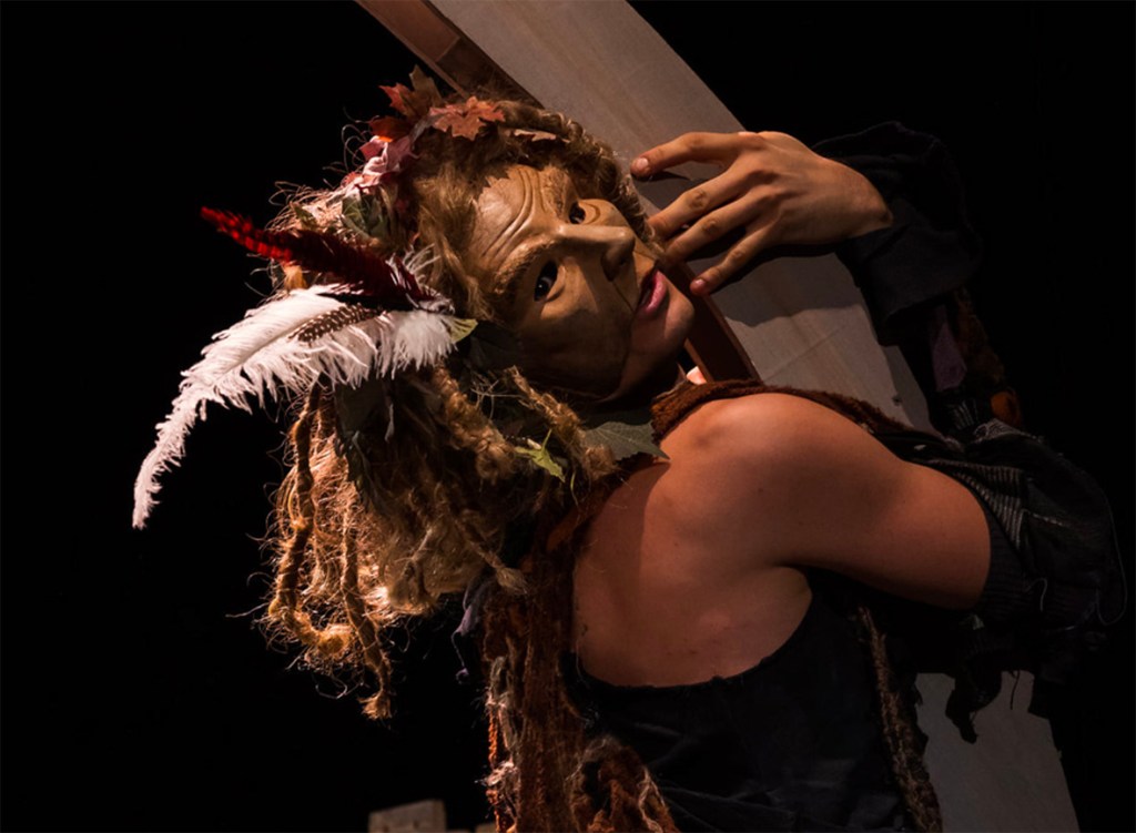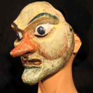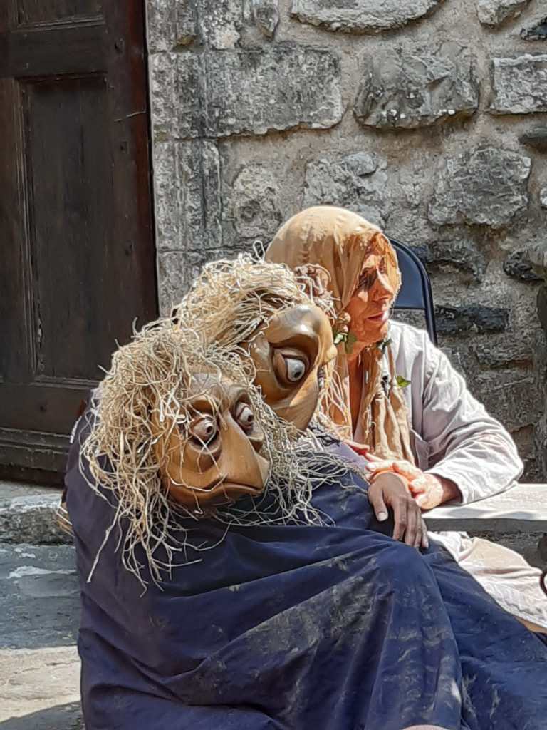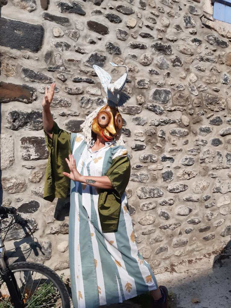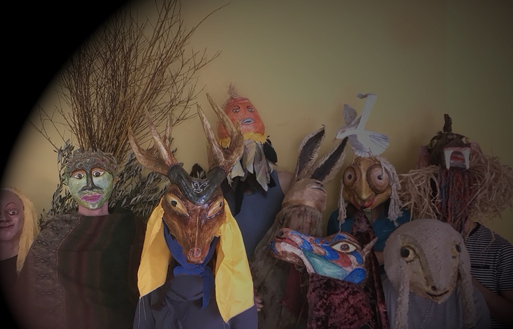 Avant d’entreprendre la création des masques j’ai lu ce texte nerveux et puissant j’en ai déduit qu’il était à la fois complètement libéré des formes classiques, On y voit une imprécation vitale de la part de la femme moquées par la soldatesque sarcastique, insolente qui joue avec son malheur. Face aux formes expressionnistes de la femme qui affirment sa détermination et sa force intérieure déambulent des hommes grotesques faussement costauds. Tous ont tous des yeux exorbités : la femme parce qu’elle crie son désespoir et les hommes parce qu’ils sont étonnés d’une telle ténacité et pour tenter (en vain) de lui faire peur, de la dissuader devant l’audace et la naïveté de sa démarche.
