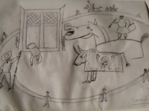 Avant d’entreprendre la création des masques j’ai lu ce texte nerveux et puissant j’en ai déduit qu’il était à la fois complètement libéré des formes classiques, On y voit une imprécation vitale de la part de la femme moquées par la soldatesque sarcastique, insolente qui joue avec son malheur. Face aux formes expressionnistes de la femme qui affirment sa détermination et sa force intérieure déambulent des hommes grotesques faussement costauds. Tous ont tous des yeux exorbités : la femme parce qu’elle crie son désespoir et les hommes parce qu’ils sont étonnés d’une telle ténacité et pour tenter (en vain) de lui faire peur, de la dissuader devant l’audace et la naïveté de sa démarche.