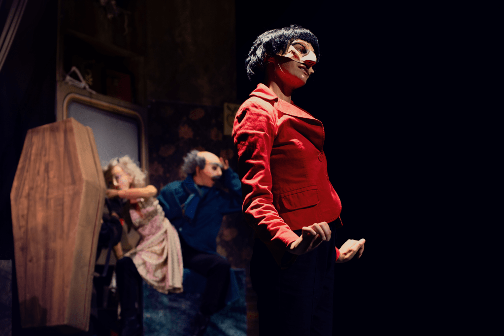 aussi un drame familial qui se joue. On y parle de transformation, de devenir qui on aimerait être : dépasser le carcan de la famille et s’opposer à l’injonction à suivre un chemin tout tracé imposé par la société et les traditions familiales. Les personnages sont joués par des comédiens masqués et des marionnettes sur différentes échelles d’espace scénique, ce qui permet la dimension ludique et décuple l’imaginaire du public de tous les âges.